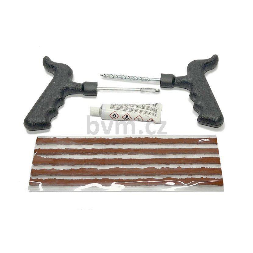 Sada na rychlou opravu bezdušových pneumatik bez nutnosti demontáže pláště z disku. Tato sada je vhodná jak pro automobily, tak pro motocykly, čtyřkolky a další bezdušové pneumatiky.